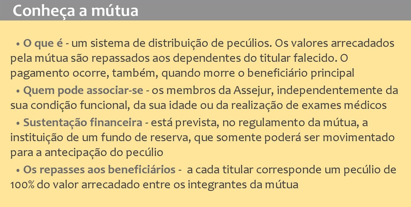 A mútua da Assejur, um mecanismo de distribuição de pecúlios a dependentes de assessores jurídicos falecidos, vai ser reformulada. O benefício existe desde os primeiros tempos da associação. Em 1998, a entidade aprovou o regulamento que está em vigor, mas vários detalhes ainda precisam ser ajustados. No último dia 13 de fevereiro, o tema foi incluído na pauta da assembleia geral, que analisou como está funcionando a arrecadação e o repasse das verbas. A intenção da diretoria é incluir a mútua numa ampla reforma estatutária, que terá início este ano.