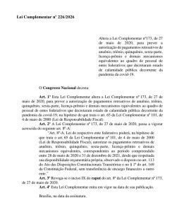 Com a vigência da Lei Complementar nº 226, sancionada no dia 13 de janeiro de 2026, foi aberta a possibilidade de pagamento de direitos que haviam sido suspensos durante a pandemia de Covid-19. Esses direitos abrangem as várias esferas da administração pública. Entre as verbas liberadas, estão incluídas vantagens como retroativos de anuênio, triênio, quinquênio e licença especial. A nova legislação altera a Lei Complementar nº 173, de 27 de maio de 2020, que disciplinava a matéria. Com a mudança, os direitos que estavam congelados poderão ser requeridos administrativamente, e estarão sujeitos a análises individuais pelos órgãos competentes.