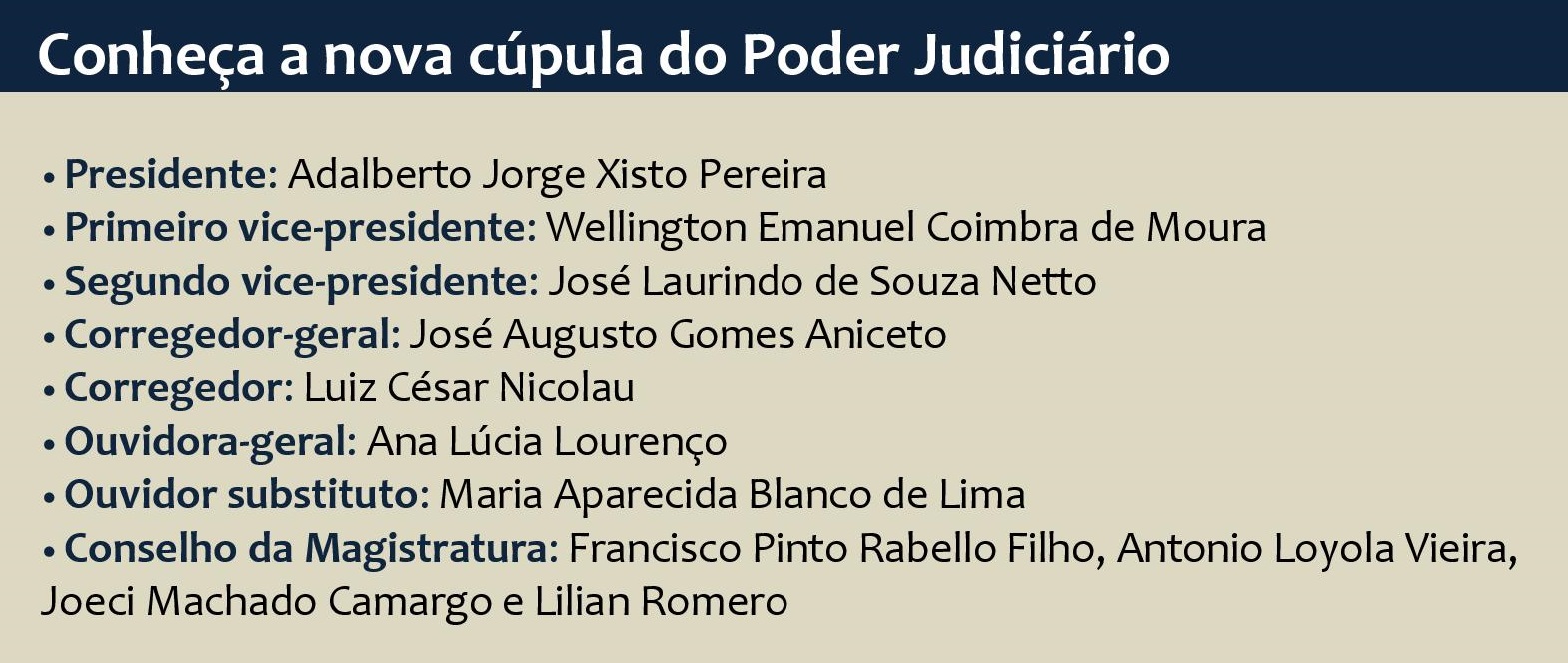 Quem tomou posse – Além do presidente, foram empossados os seguintes desembargadores: Wellington Emanuel Coimbra de Moura (primeiro vice-presidente), José Augusto Gomes Aniceto (corregedor geral da Justiça); José Laurindo de Souza Netto (segundo vice-presidente) e Luiz César Nicolau (corregedor da Justiça).