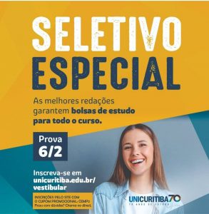 As faculdades Unicuritiva, um dos grupos de ensino conveniados com a Assejur, estão oferecendo bolsas de graduação de até 100%. O benefício está condicionado a um “vestibular de bolsas”, programado para o dia 6 de fevereiro, que selecionará as melhores redações. As escolhidas garantirão bolsas de estudo para todo o curso. Os interessados podem fazer contato com Katiane Coldibeli Comercial Empresa Unicuritiba (https://wa.me/message/N632X65QAEJAA1).